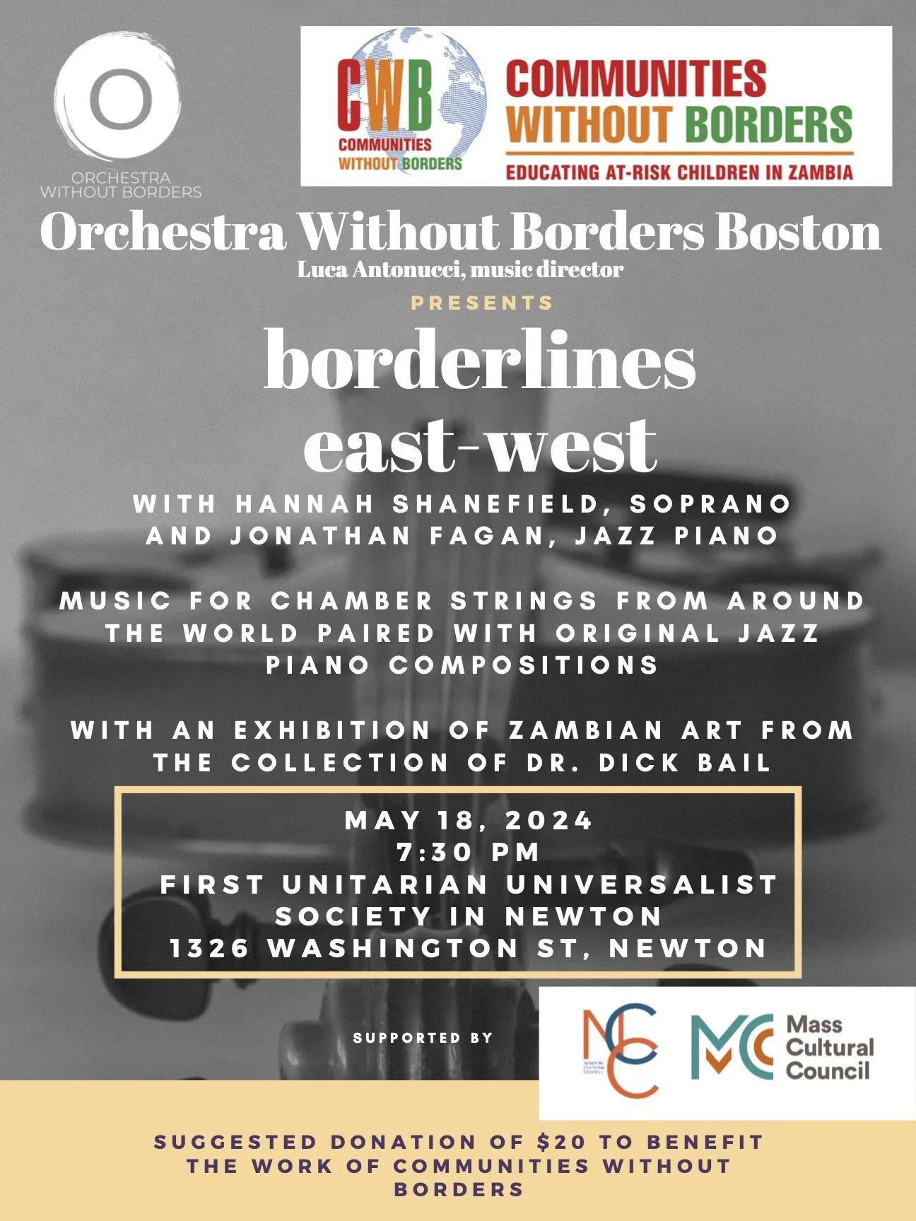 Join Jonathan Fagan, Hannah Shanefield, and the Orchestra Without Borders on May 18th at 7:30 at the First Unitarian Society in Newton. Free admission.